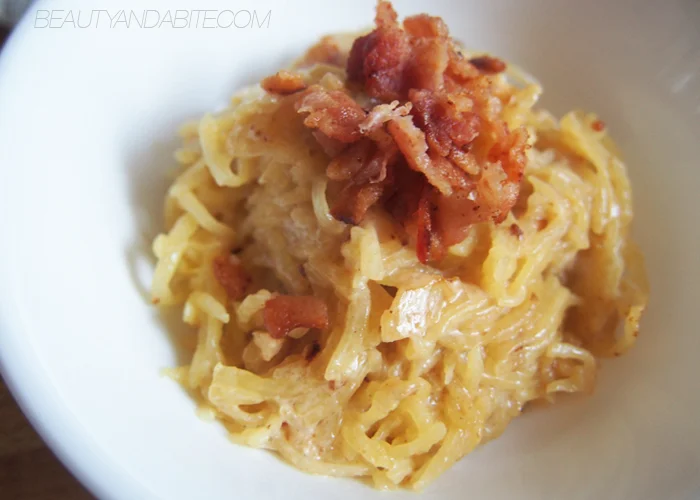 Place your squash and sauce in a bowl or plate and crumble bacon on top. You’re done! The squash will be surprisingly intact (not mushy) and all you’ll taste is creamy, garlic-y, bacon-y goodness! This dish totally satisfies my pasta craving (and that’s saying a lot). Highly recommended; please try and let me know what you think!